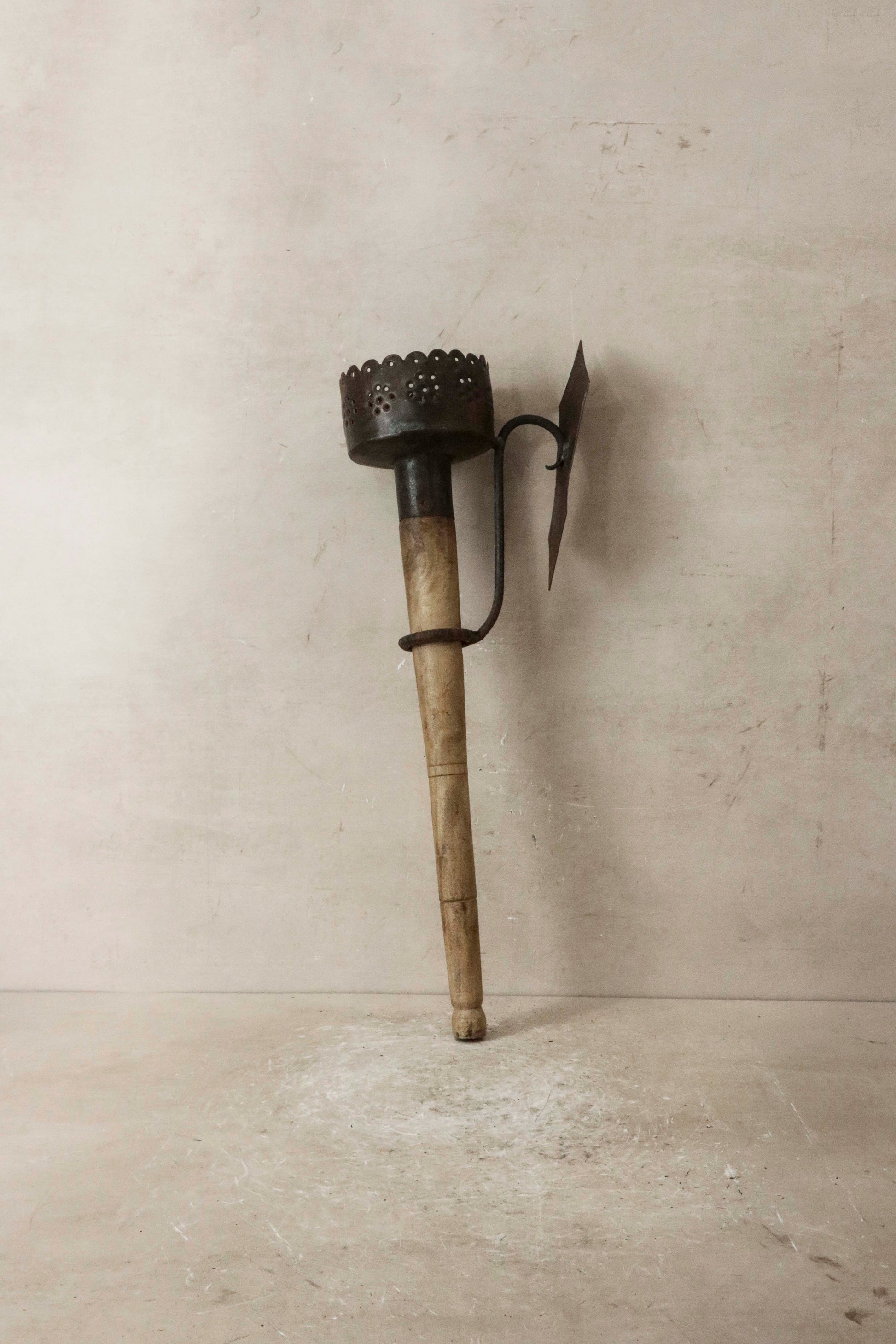 This vintage teak wall sconce is a beautiful embodiment of rustic charm and mid-century design. Crafted from solid teak, the sconce features a rich, warm wood tone with intricate grain patterns that give it a distinct, natural appeal. The design is simple yet elegant, with a smooth backplate that mounts flush against the wall. A gently curved teak arm extends outward, holding a circular or bowl-shaped holder designed to accommodate a single candle. The rustic metal holder is elevated, allowing the candlelight to cast a soft, ambient glow, highlighting its texture and warmth. Perfect for adding a cozy, timeless touch to any space, this teak wall sconce is both a functional lighting piece and a decorative accent.