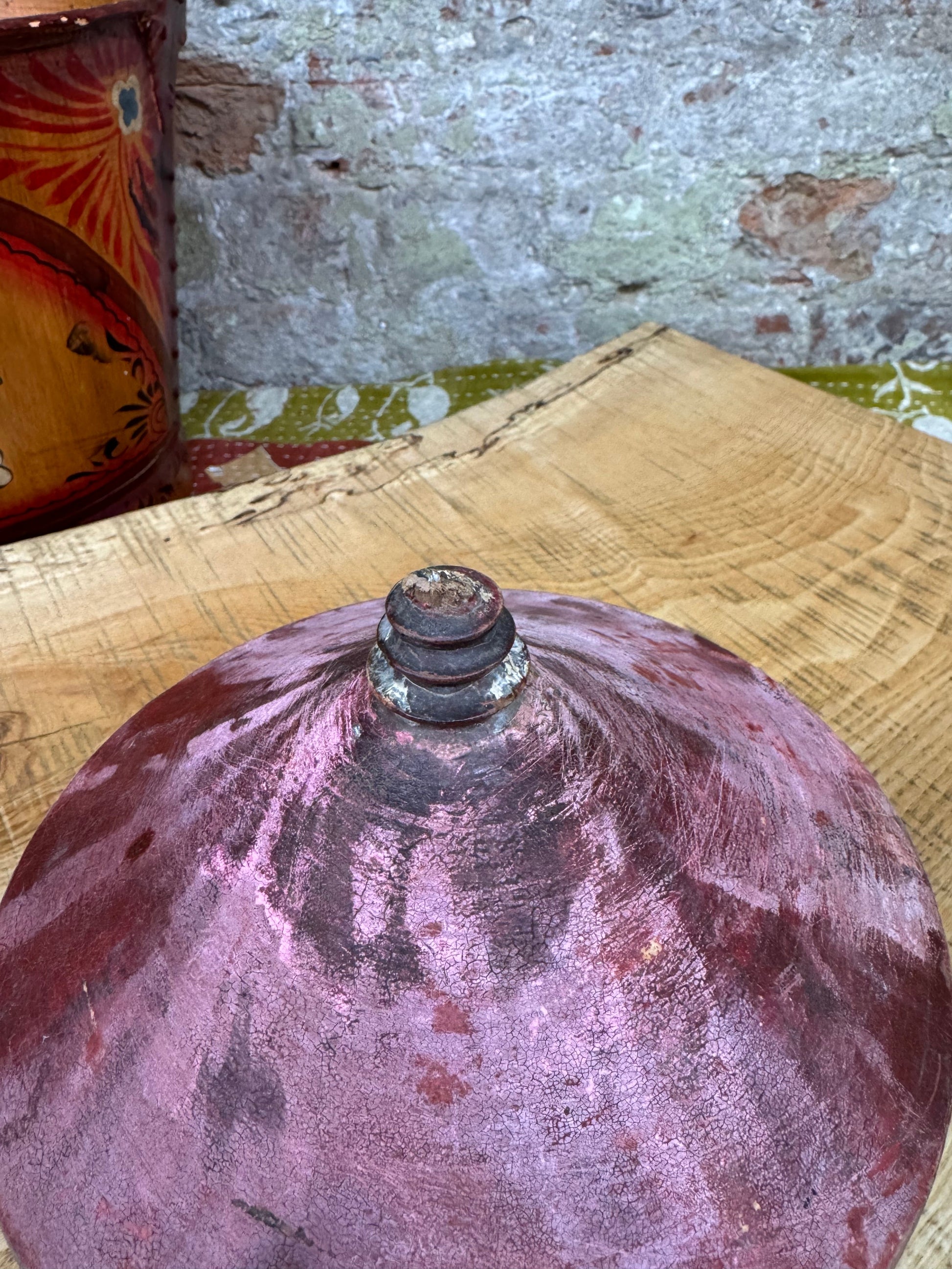 Original ceremonial tikka box features an aged red painted finish. Tikka, a dot worn on the forehead during ceremonies, is made from vermilion and sandalwood powder. This large container has a hand-turned wooden body with a pagoda-style lid. Crafted from teak and vegetable-dyed finish, it was traditionally used in temples and homes to store the powder, making it an ideal choice for keepsakes and trinkets.