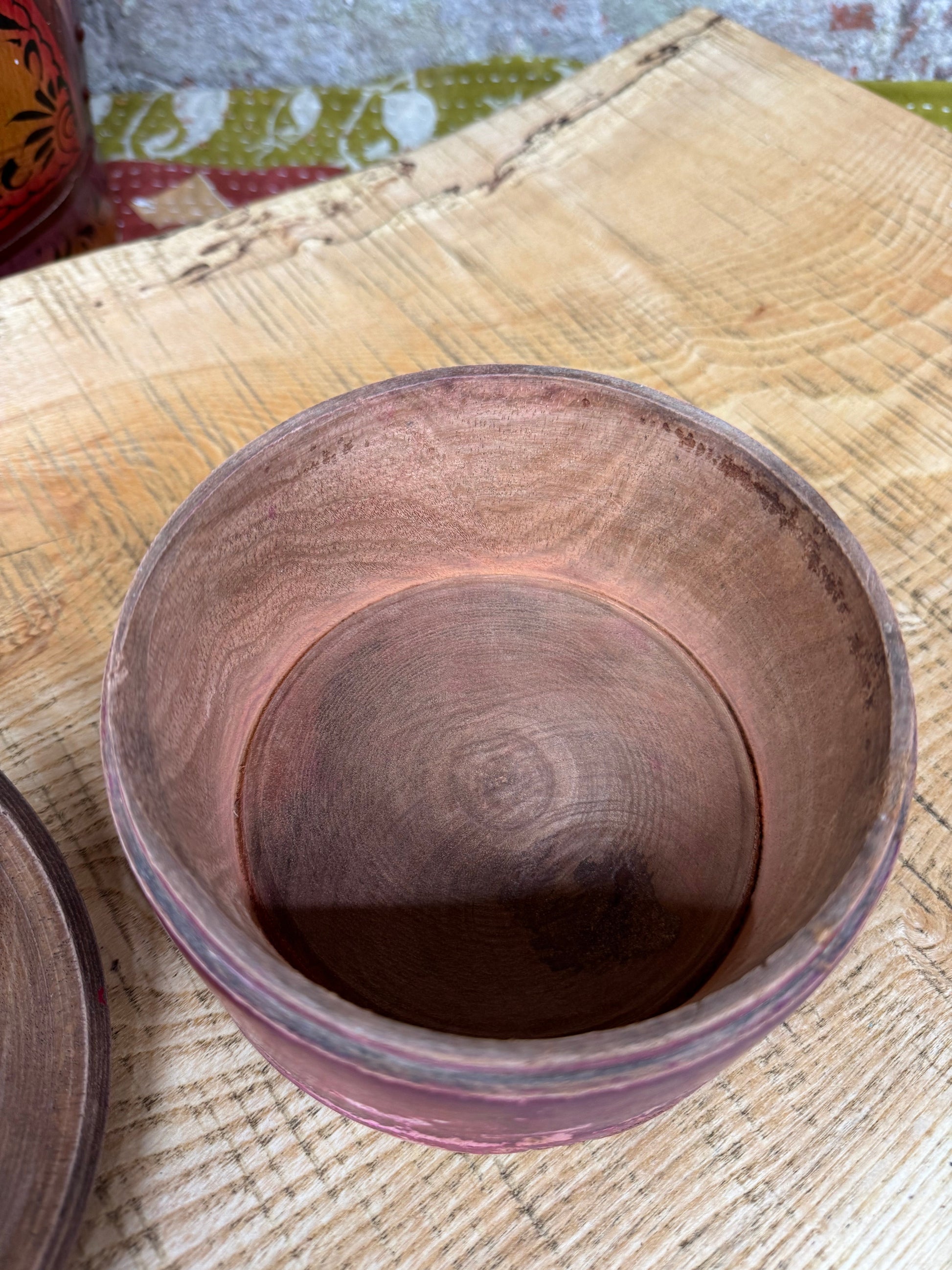 Original ceremonial tikka box features an aged red painted finish. Tikka, a dot worn on the forehead during ceremonies, is made from vermilion and sandalwood powder. This large container has a hand-turned wooden body with a pagoda-style lid. Crafted from teak and vegetable-dyed finish, it was traditionally used in temples and homes to store the powder, making it an ideal choice for keepsakes and trinkets.