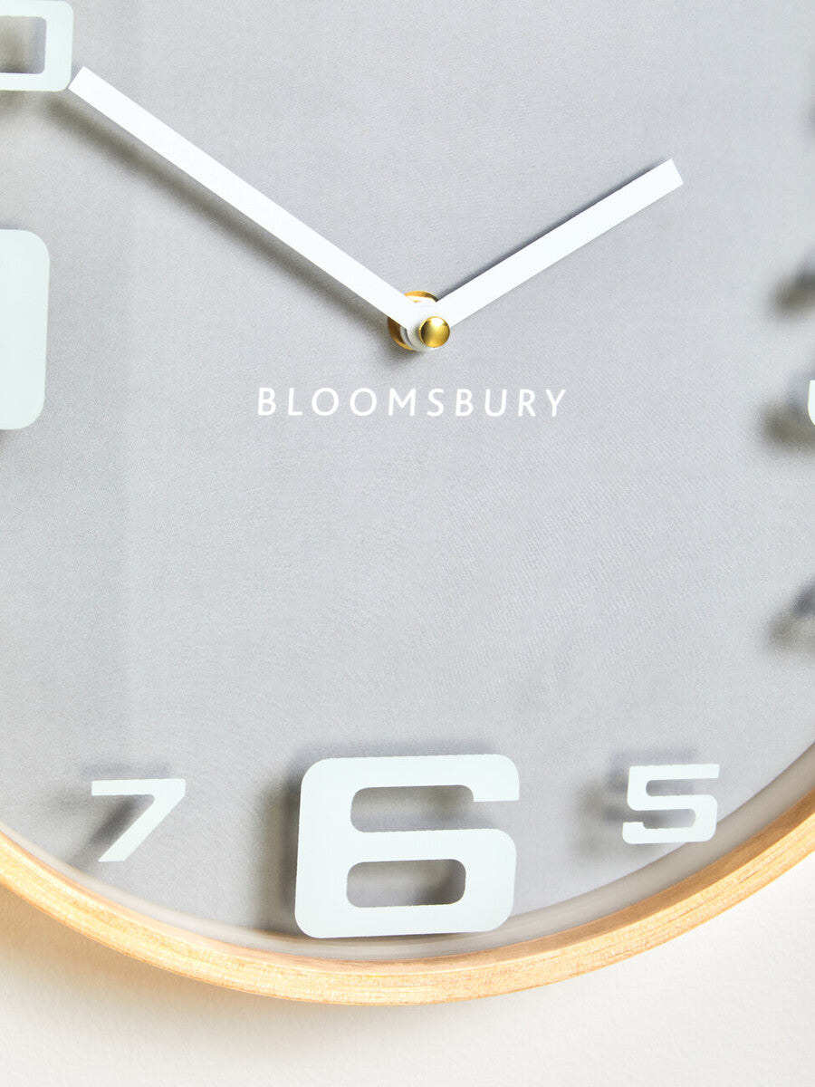 Its dial is notable for the oversized numbering at the twelve, three, six, and nine sections, with smaller numbers in between. The case is made from natural wood, and has a light colour that complements the dial's grey tone. The hands have a matching white finish, with Bloomsbury lettering located underneath. A clear glass pane covers the dial.