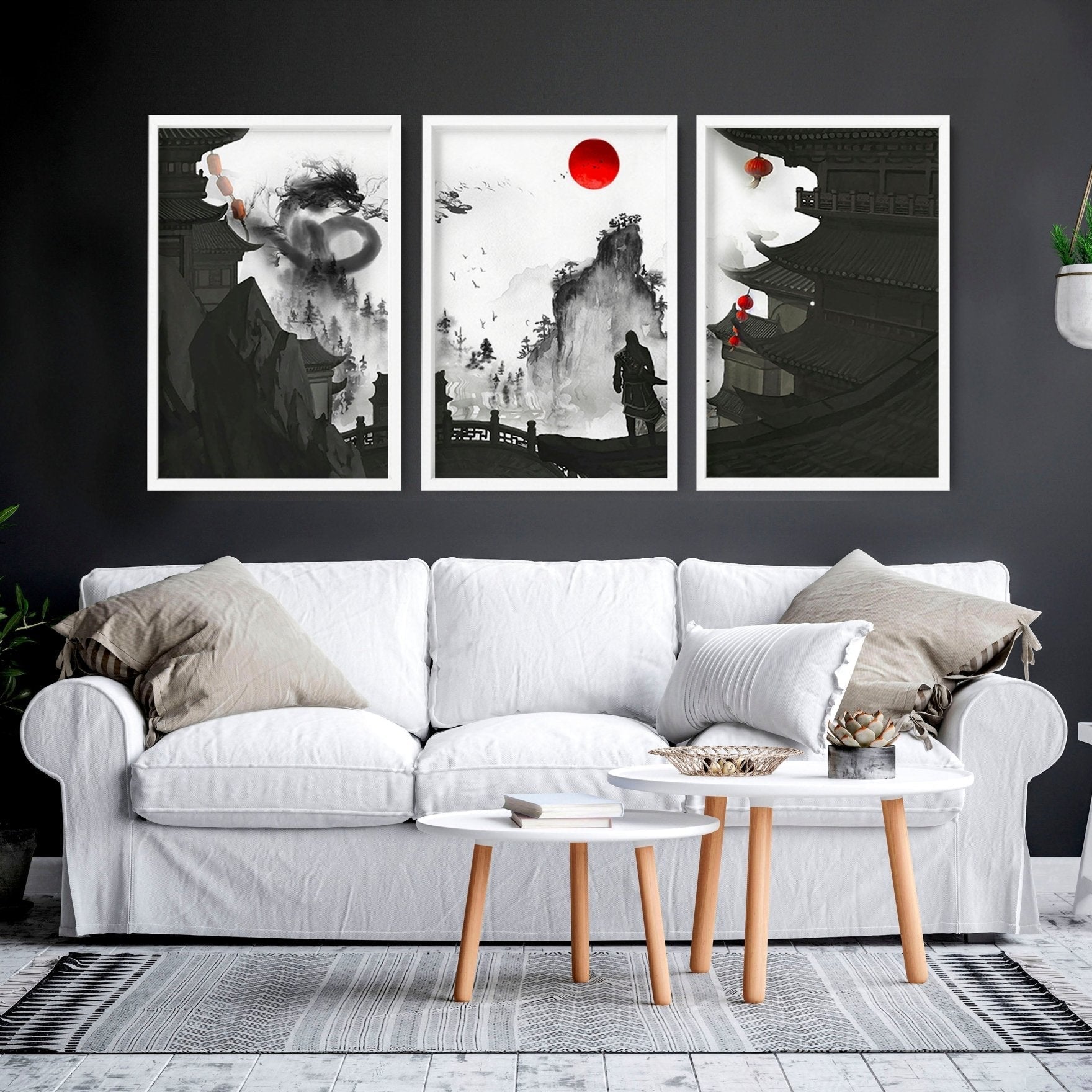Elevate your living room decor with our captivating set of three Wall art dragon prints. This striking set features bold and mesmerizing black, white, and red designs, guaranteed to make a powerful statement in your space.