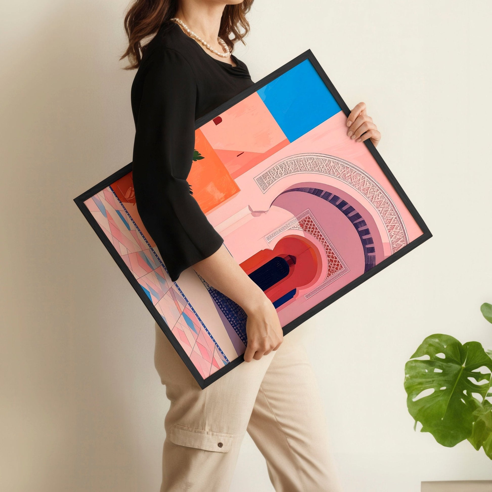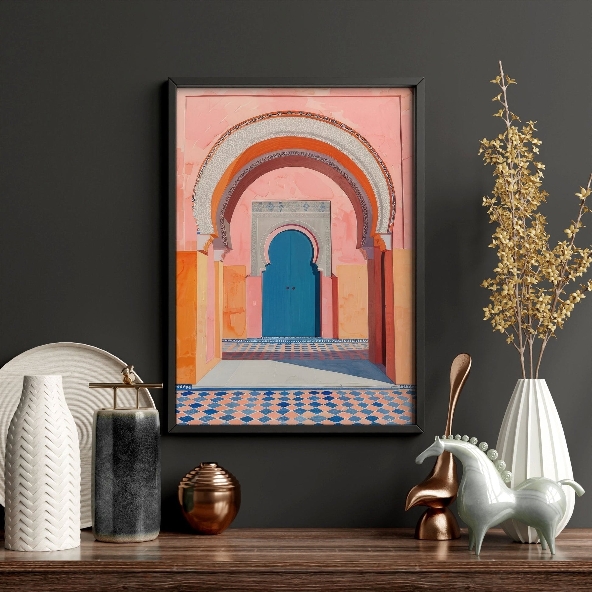 The unique designs and vibrant colours of these prints not only draw the eye but also create a rich tapestry of cultural inspiration. Furthermore, the pink wall art palette adds a gentle sophistication, elegantly balancing the traditional Moroccan style with a modern twist. Your guests won't be able to resist admiring the stunning combination of art and tradition that sets your living room apart.