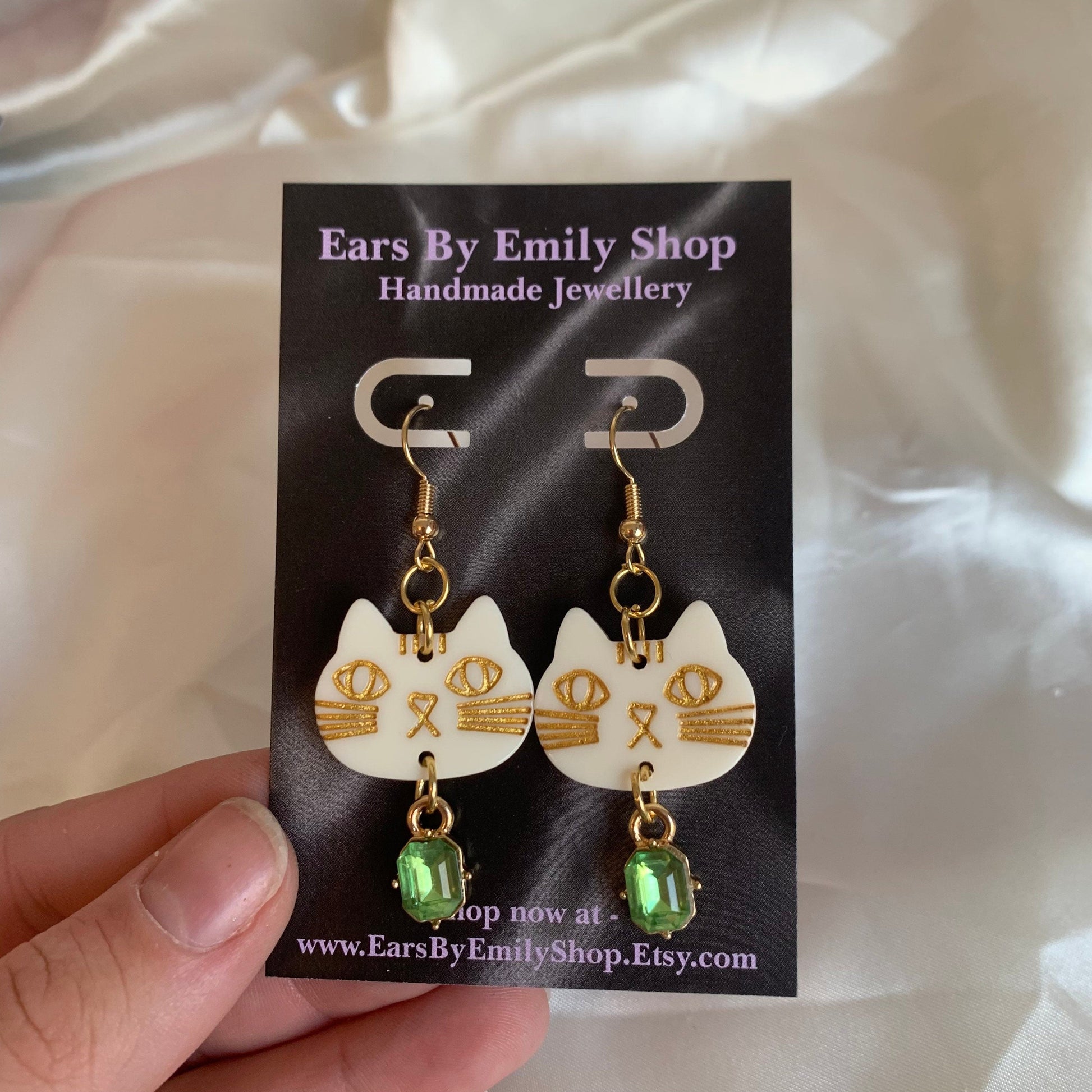 A fun pair of handmade white cat crystal earrings on 18k gold plated hooks.