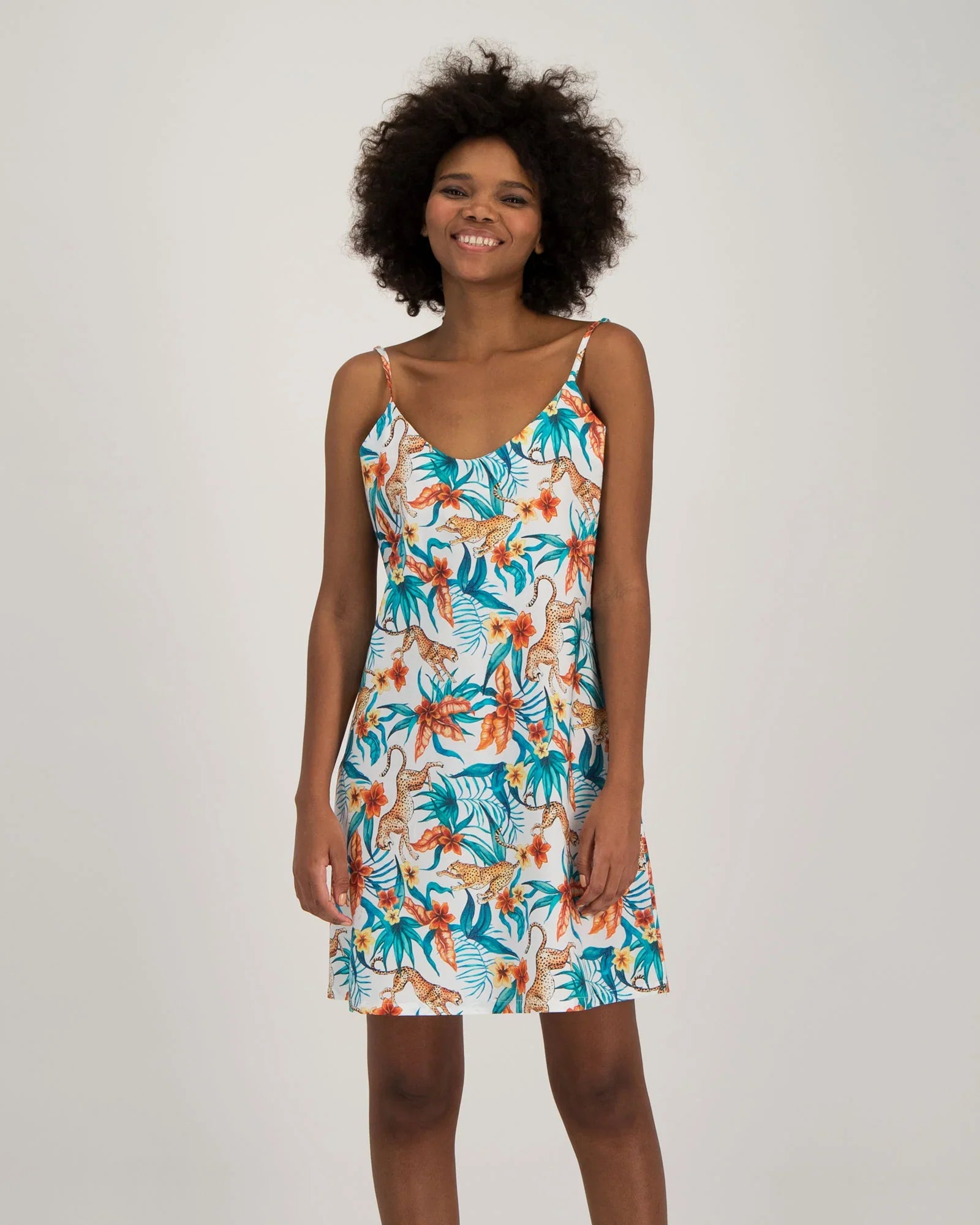 Simple but stylish. Practical yet sensual. This cotton nightie hugs your curves with a thigh-high hemline to create a perfect proportion. The pattern is bold and modern, but also feminine and sexy.