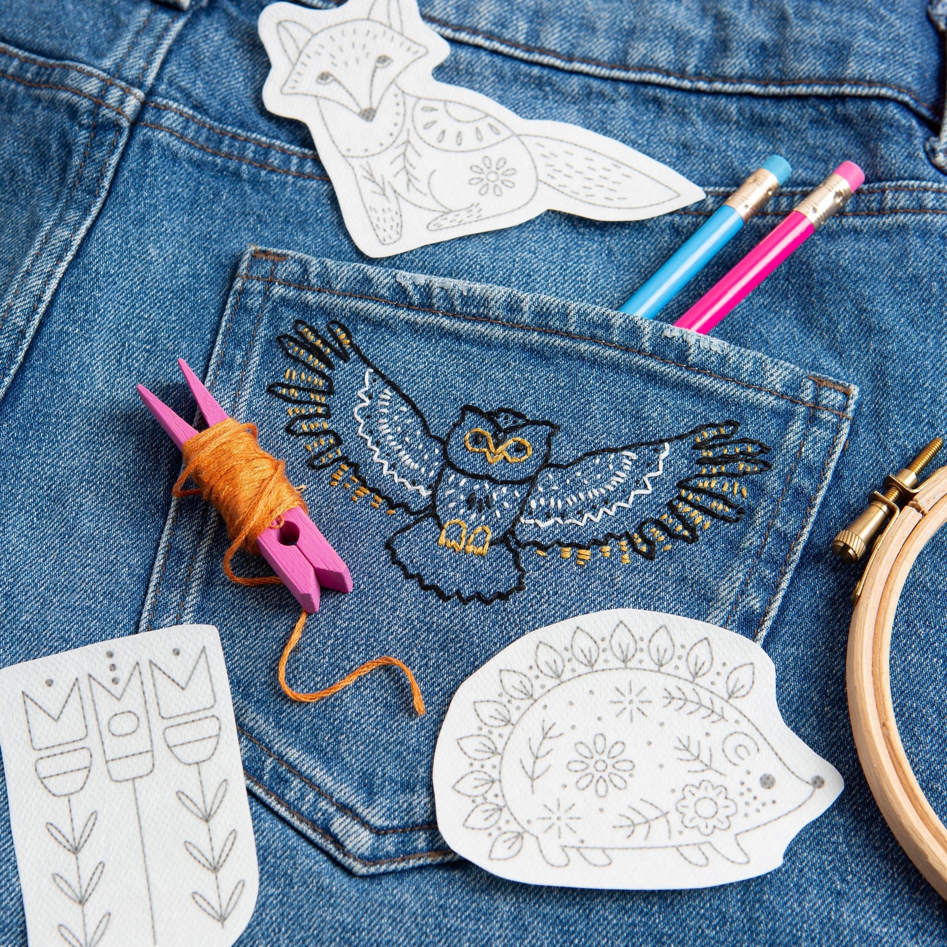 This Stick & Stitch embroidery pack is perfect for creative crafters who want a quick, easy, and satisfying project. Whether you’re customising a denim jacket, sprucing up a tote bag, or adding a handmade touch to gifts, these woodland folk motifs make it simple and fun.