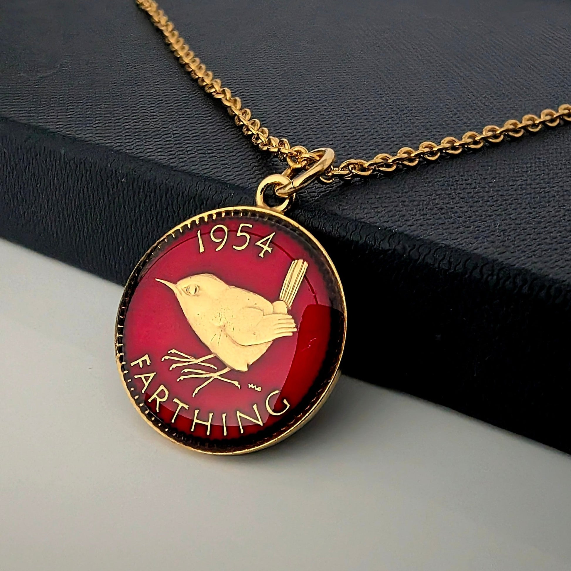 This necklace has been made using a Farthing. This coins design focuses on the well know British bird, the Wren.