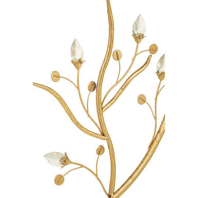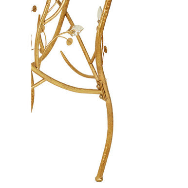 Yaxi gold metal frame console table has a textured gold finish. Its four feet scroll into the stand, while under the top, iron branches are adorned with glinting acrylic buds. Its rectangular top is crafted from wood and has a black colour that contrasts with the gold.