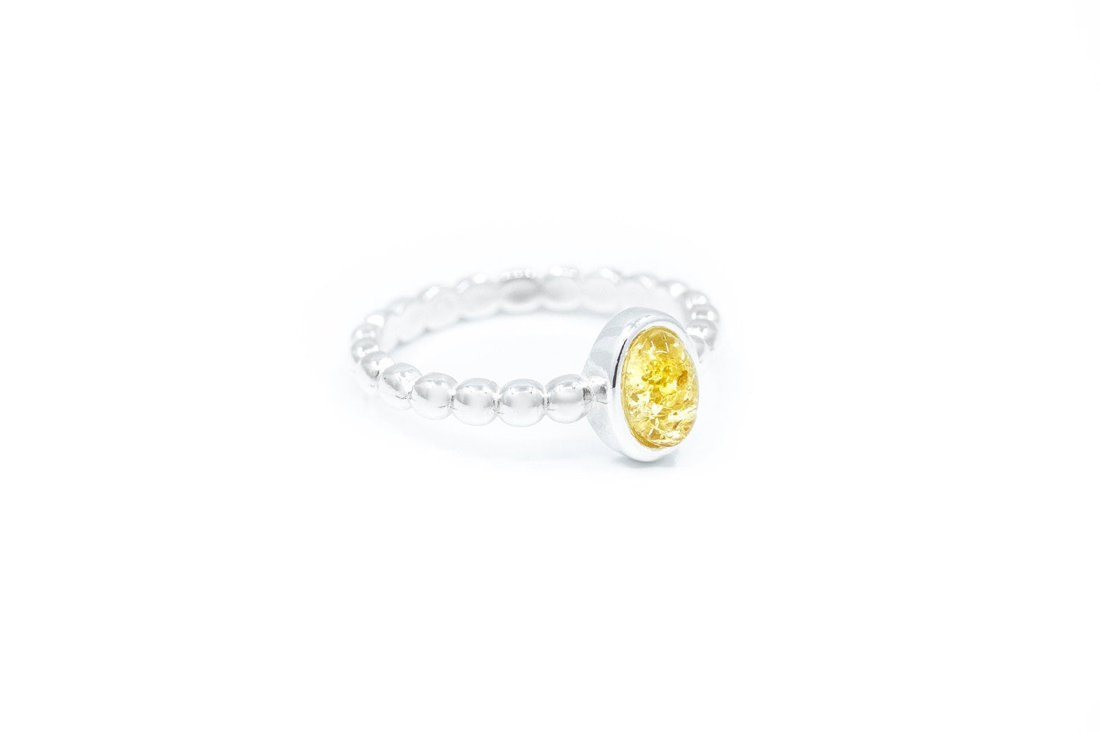 This dainty amber ring features a simple Yellow Baltic Amber gemstone at the centre of a sterling silver band with bubble detail. A minimalist design for everyday wear.