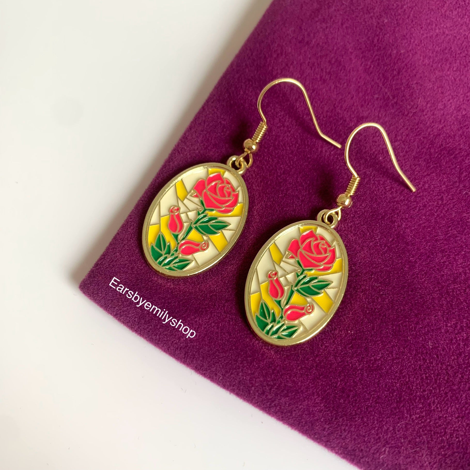 A cool pair of yellow and pink rose in oval mosaic dangle gold earrings on 18k gold plated hooks.