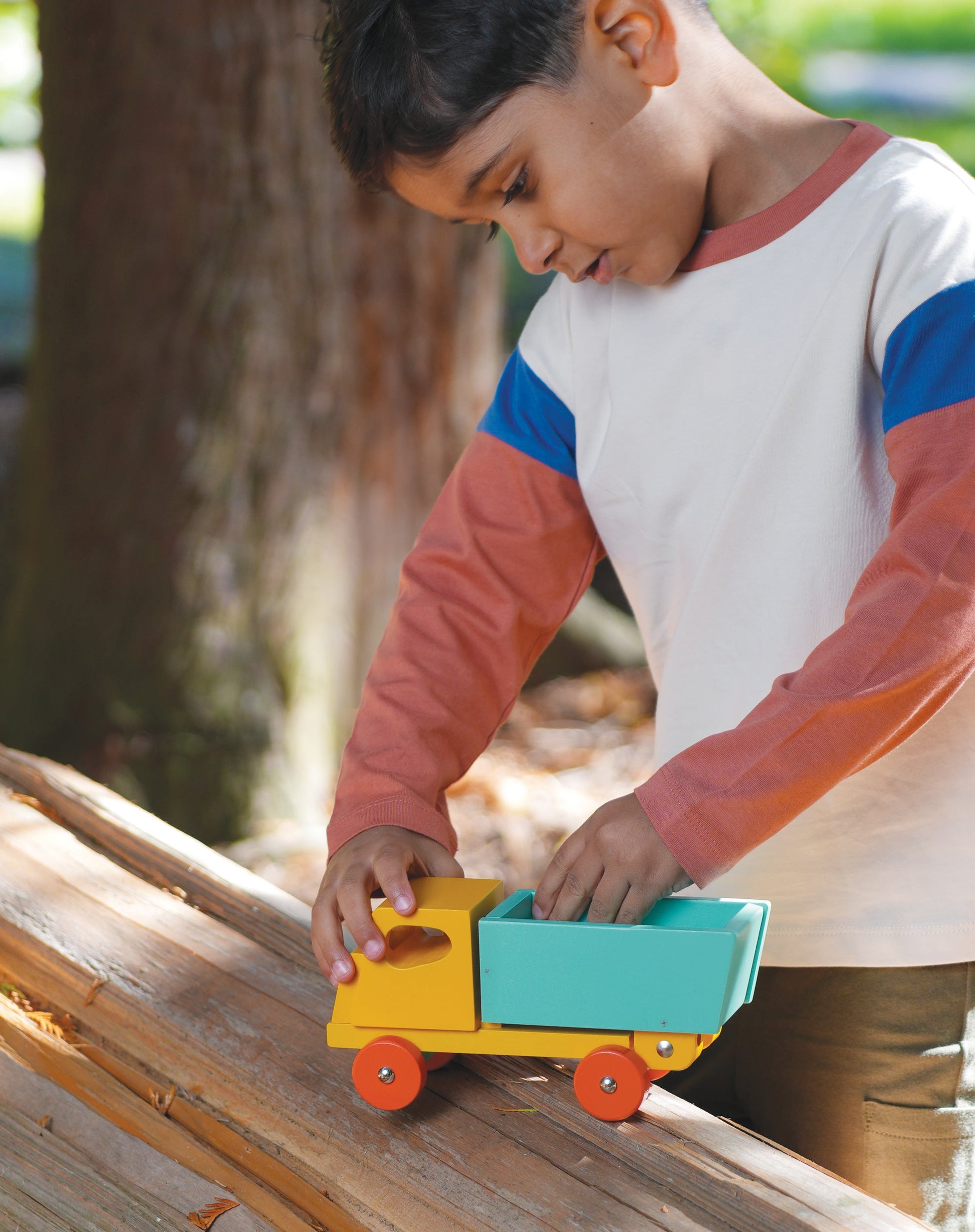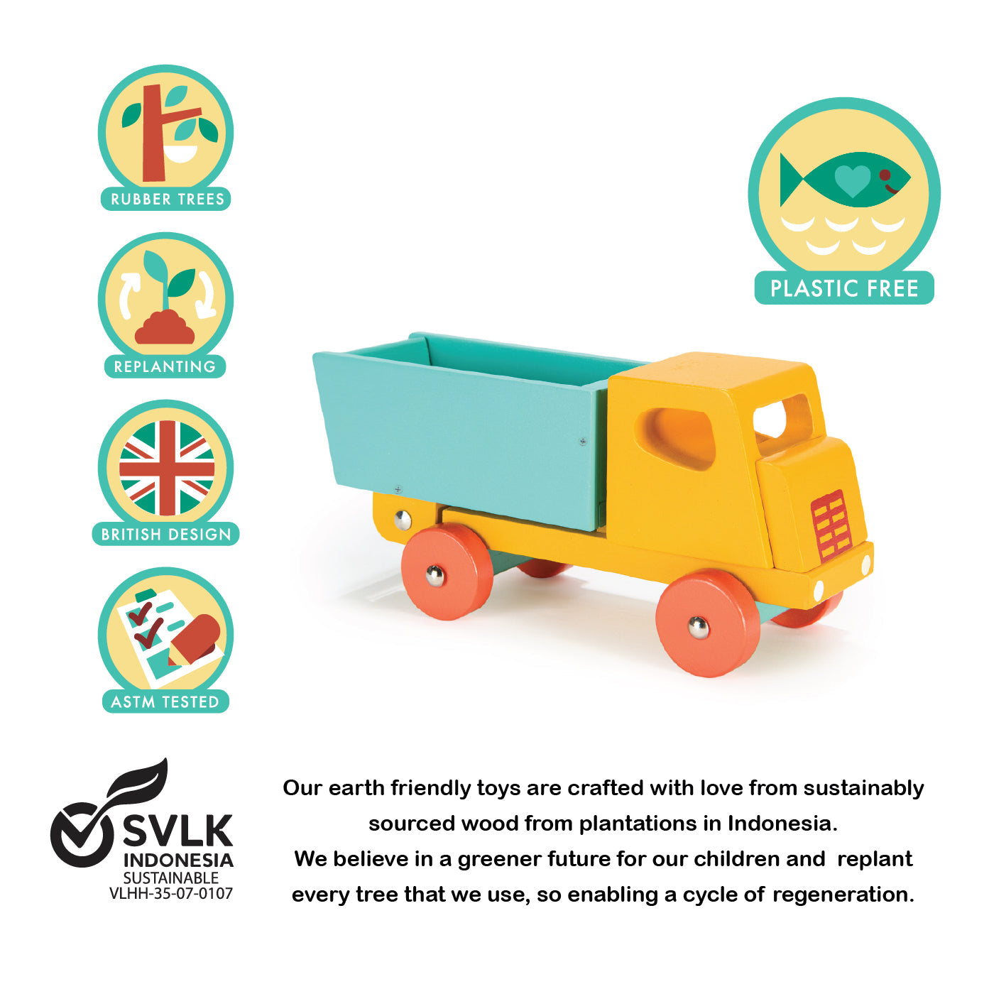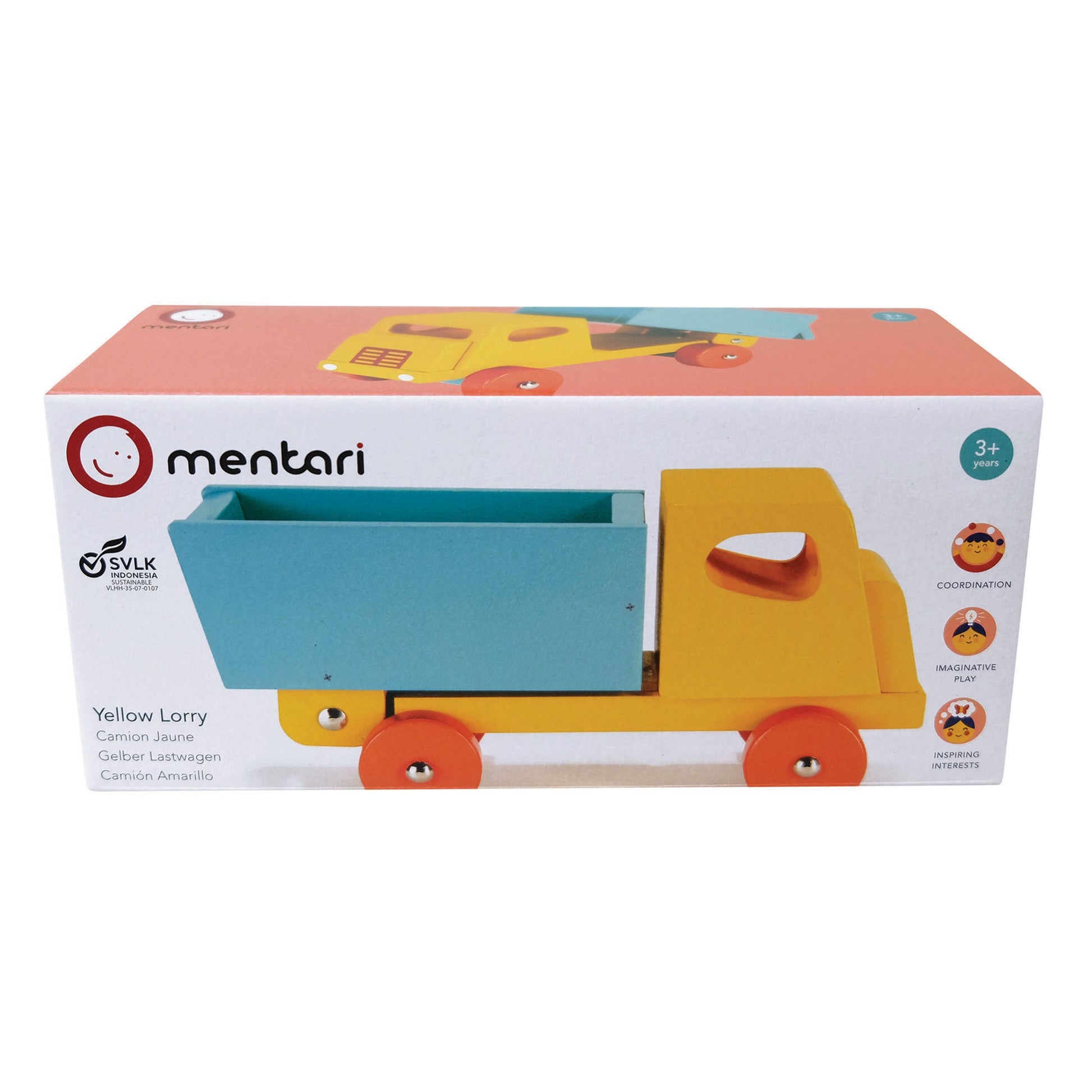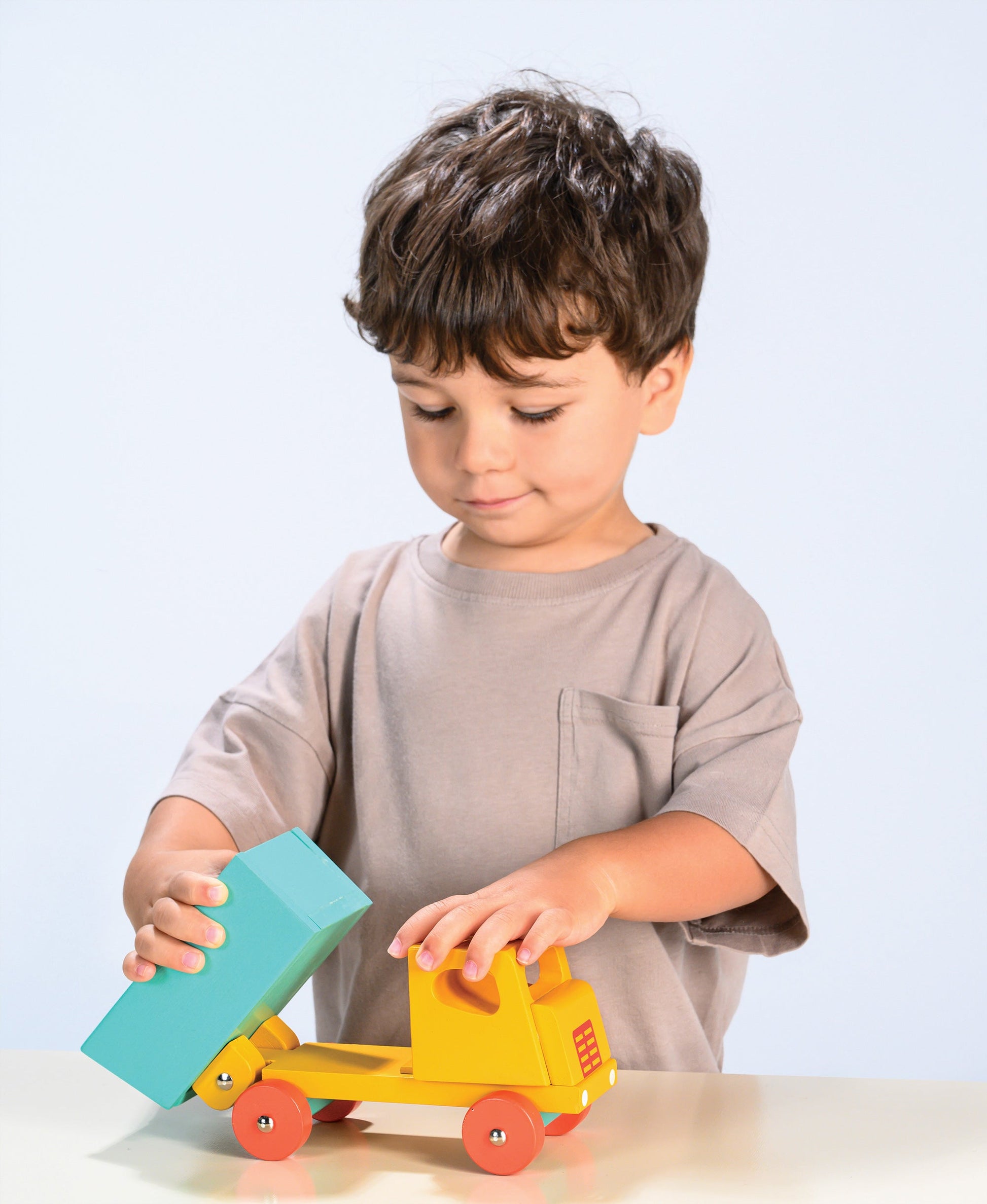 Based on a retro design, the simple clean lines give this traditional toy a refreshing look and feel. A classic big yellow lorry with tipping back part and orange wheels.