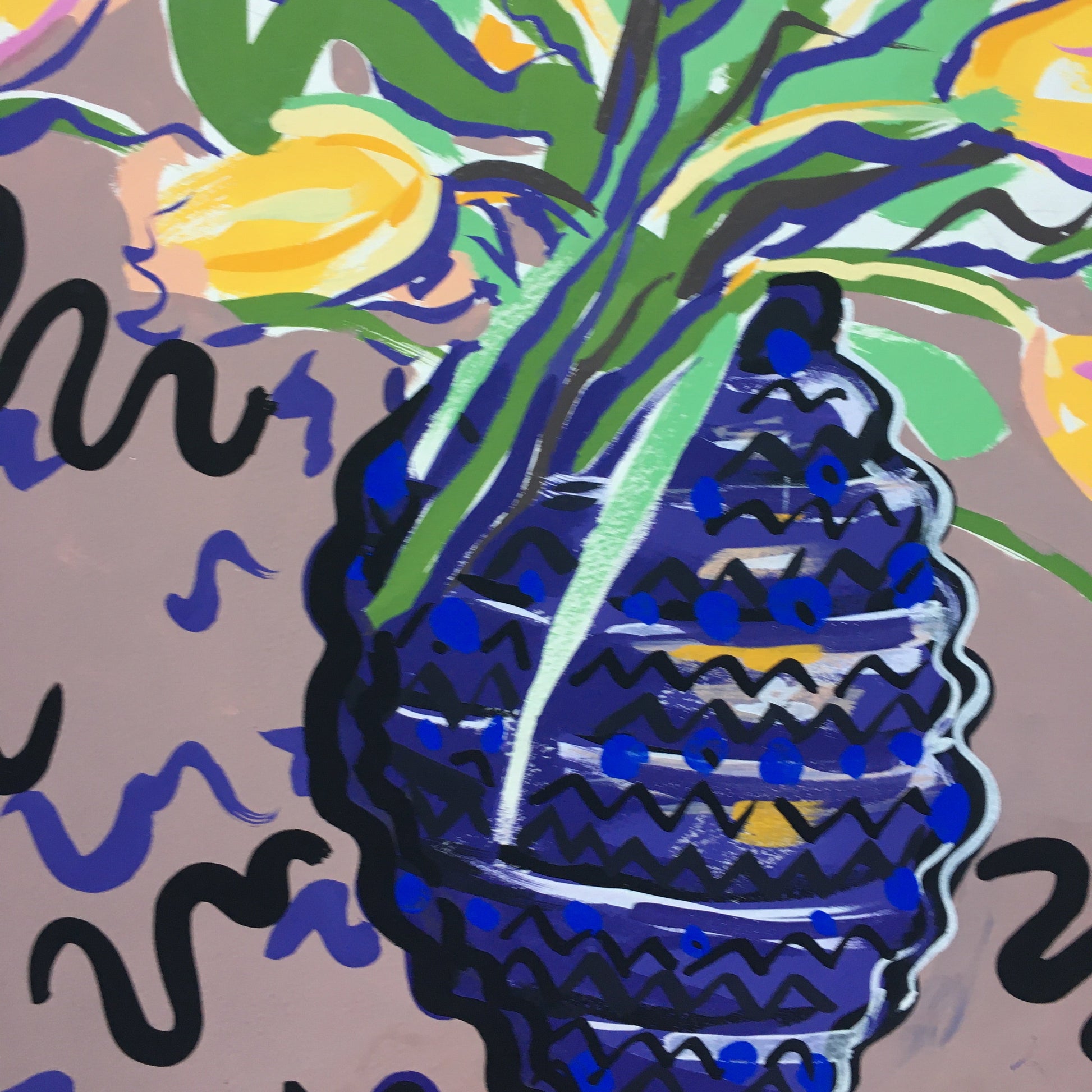 Gouache on paper. Yellow tulips on a taupe ground.