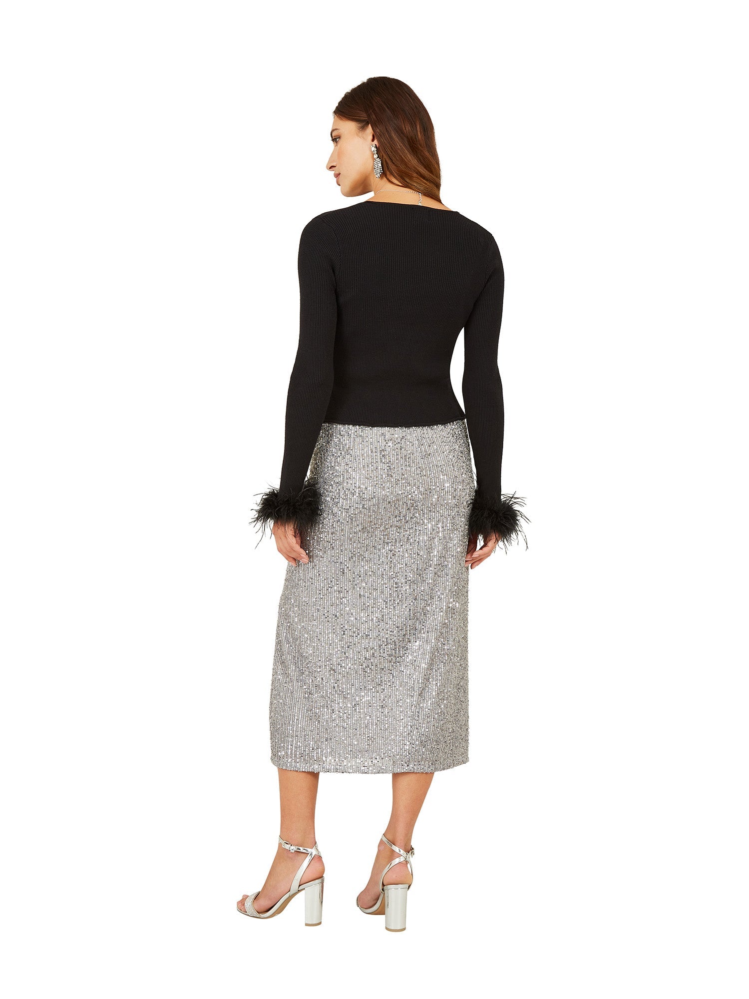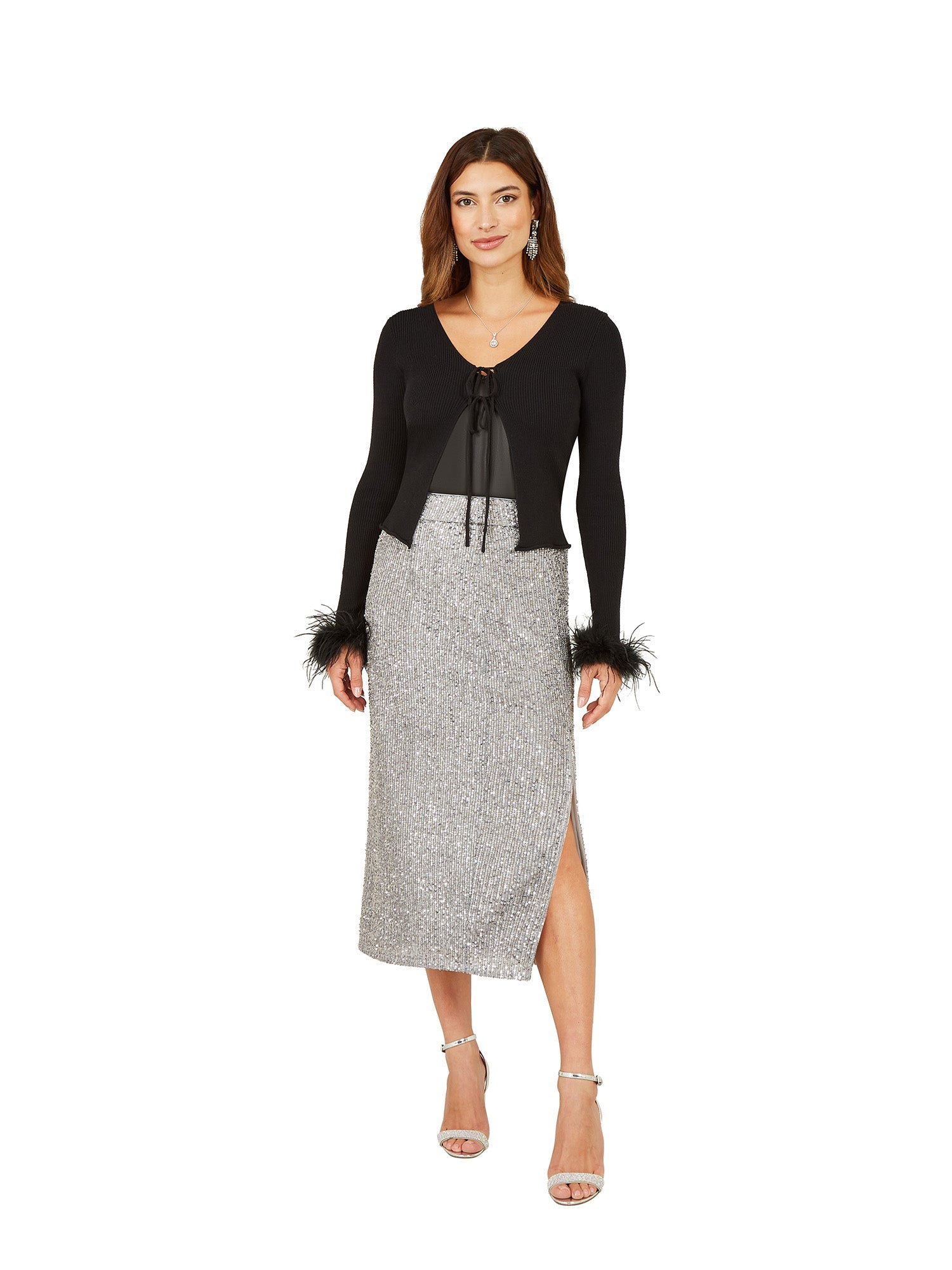 Impactful dressing can be achieve with comfort and style all tied up. This ribbed bolero from Yumi is the perfect marriage of sleek and statement style. With full length sleeves that finish with a flourish of feather on the cuff, and double tie front. We adore this piece dressed up with a sequinned Cami and flowy wide legs trousers. Size reference, Small 8-10, Medium 10-12, Large 12-14.