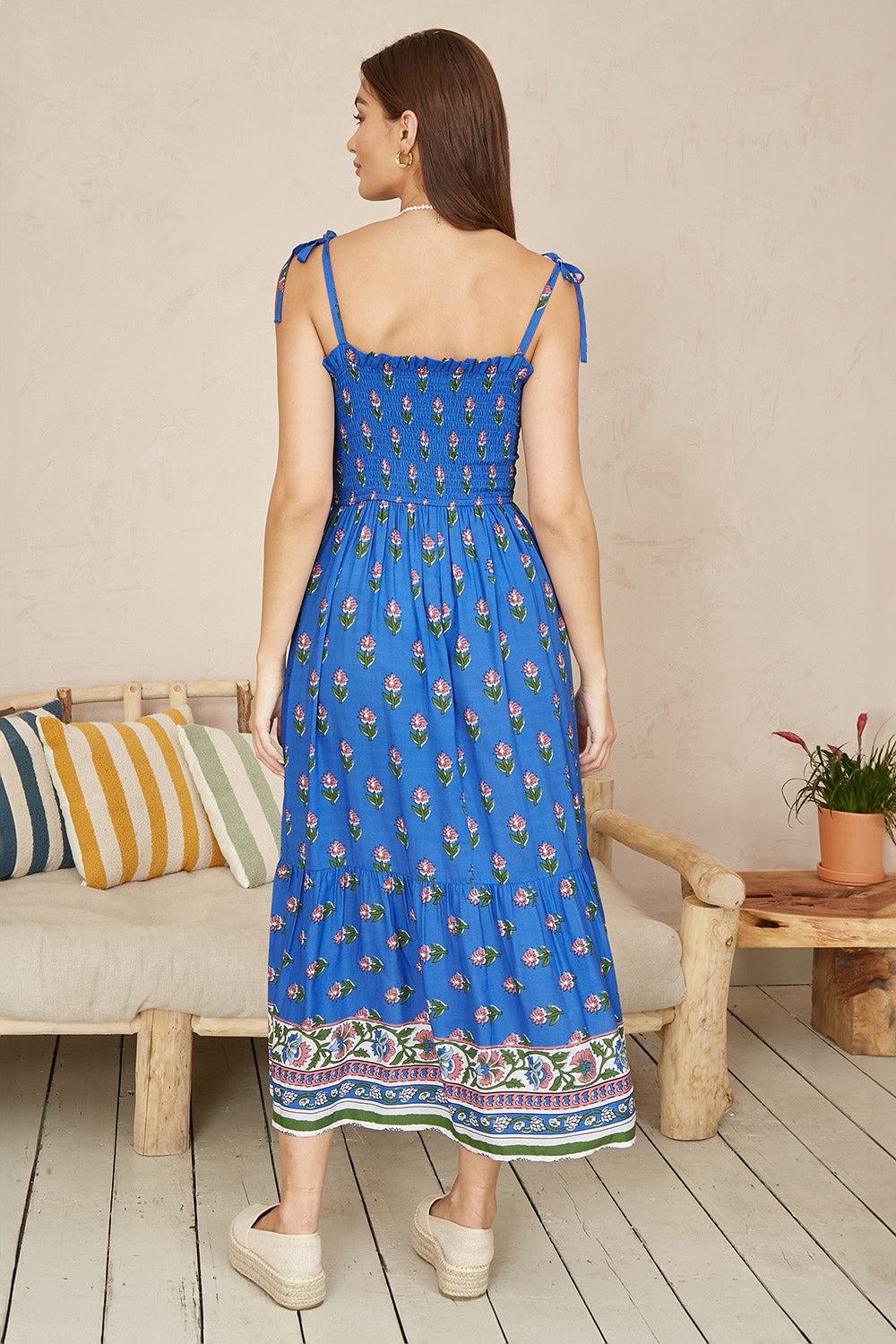 This super cute little summer dress made from lightweight modal fabric is perfect for keeping cool in the sun. With love the paisley style print paired with the simple midi shape. The bodice is ruched with tie strappy sleeves for the perfect fit every time. Wear with sandals and a wicker bag to complete the fit.