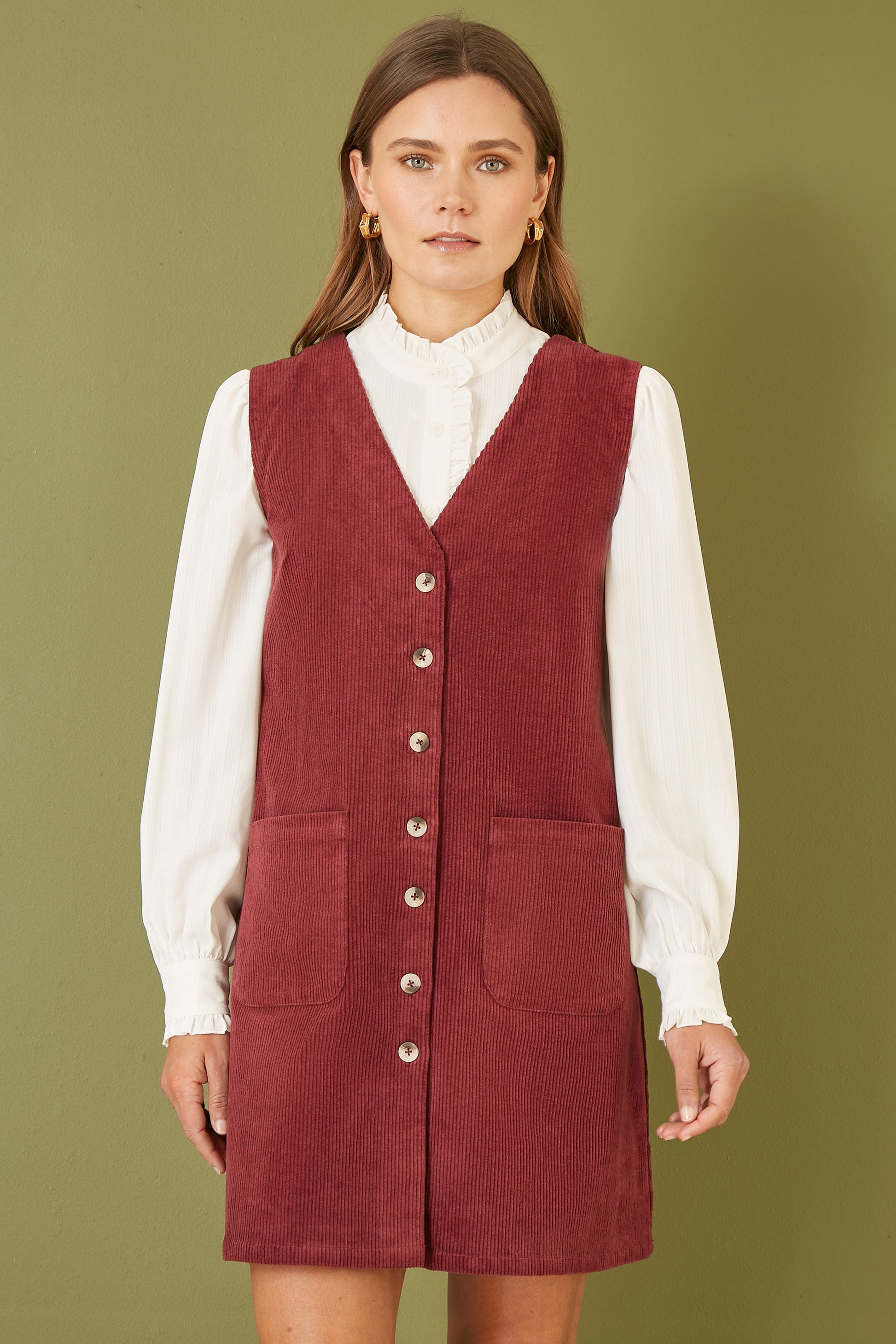 Yumi Burgundy Cord Button Through Pinafore Dress With Pockets