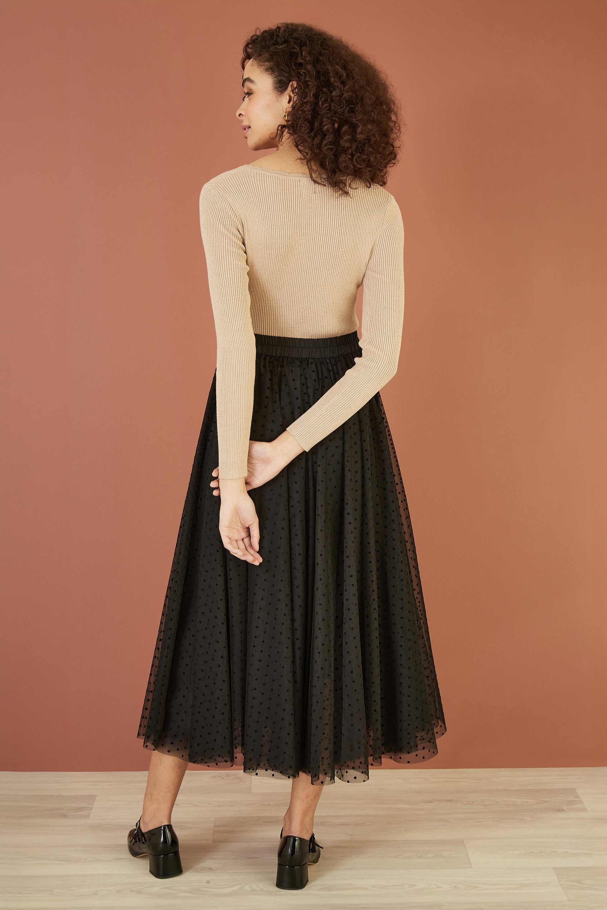 This cute fitted top from Yumi is perfect for the changing seasons - In a shimmering Metallic lightweight knit, the ribbed design adds some comfort to this style. The scallop round neckline and long sleeve design is perfect for pairing with your jeans and trainers for a casual look.