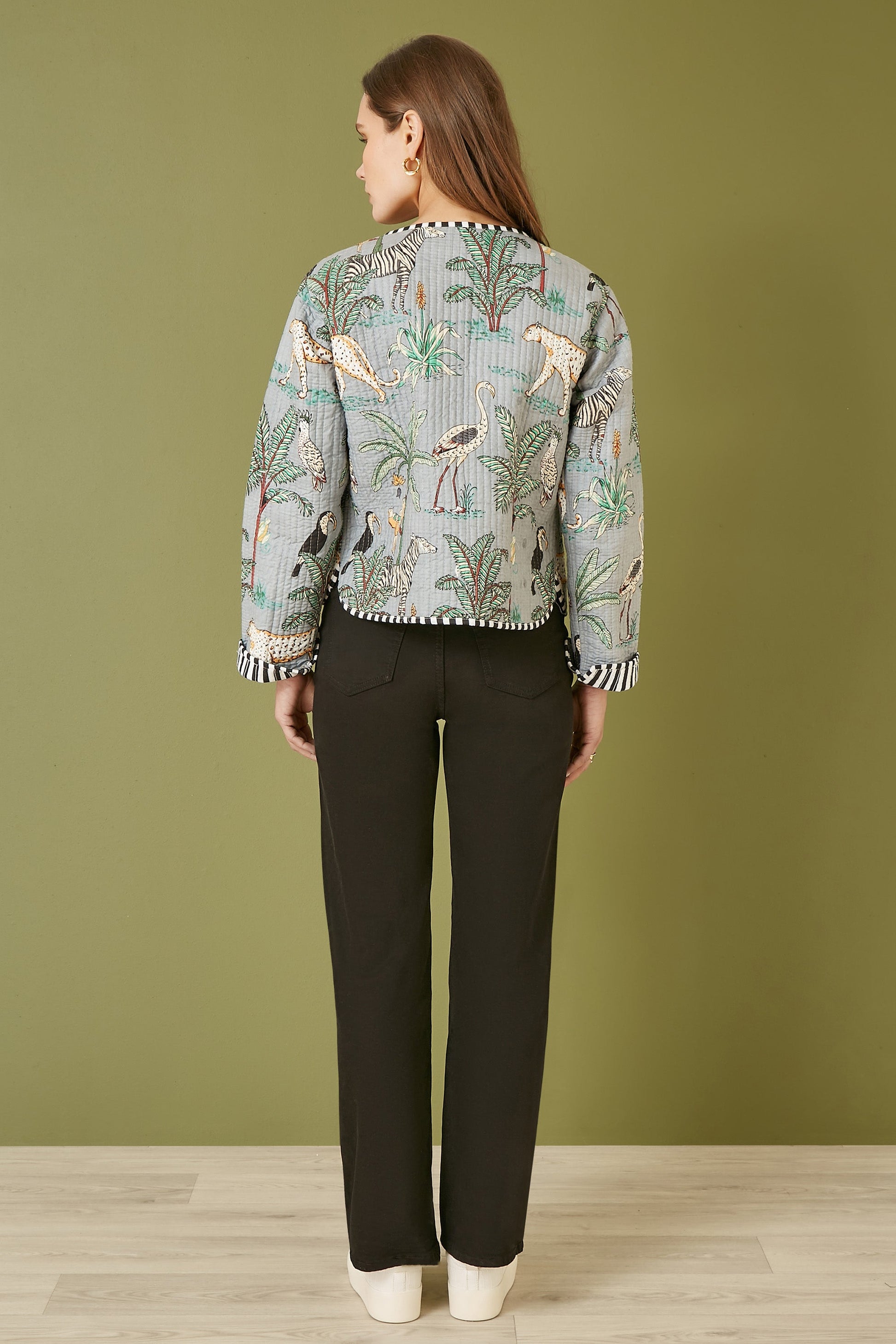 Yumi Grey Animal Print Reversible Cotton Cropped Quilted Jacket