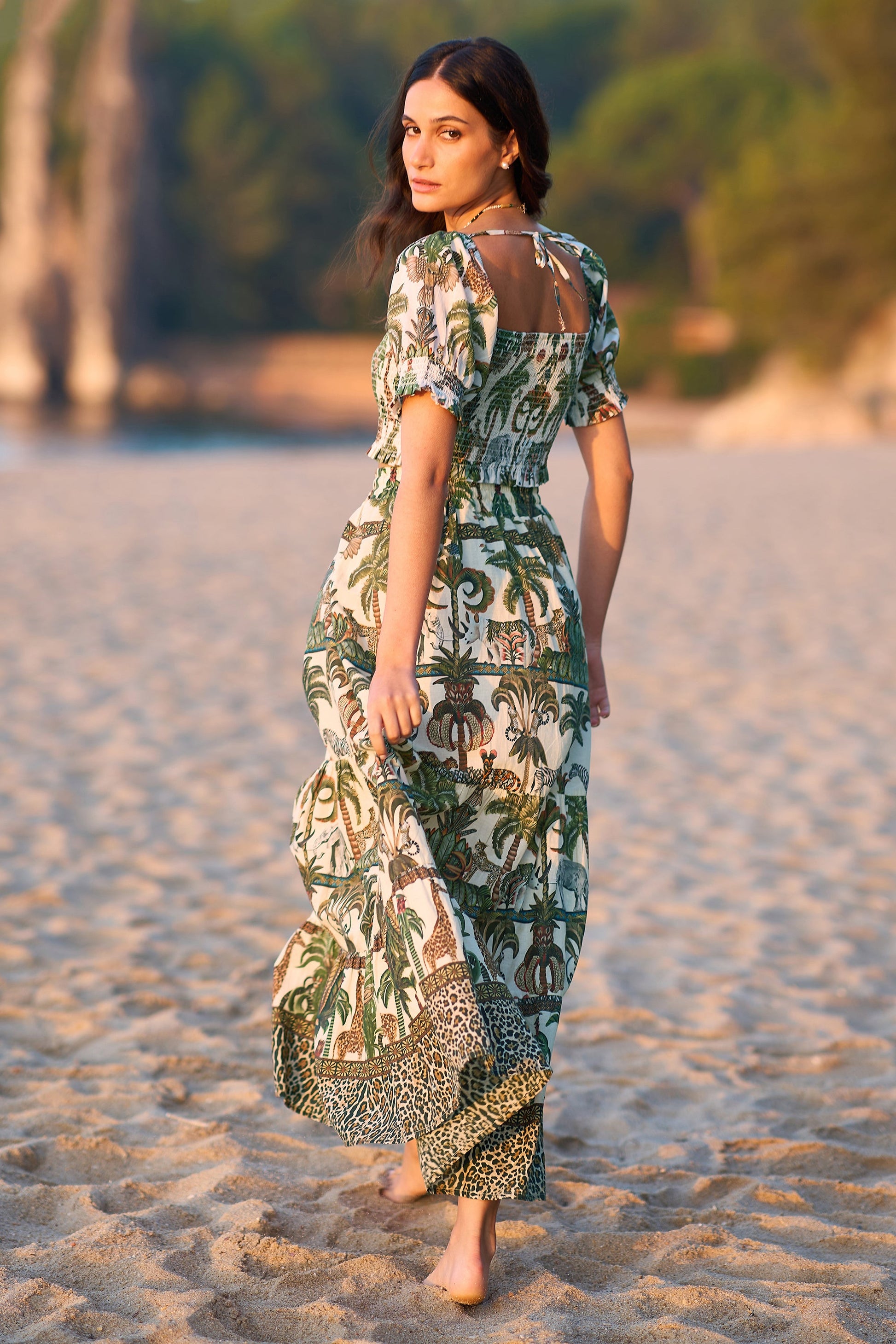 Made from lightweight organic cotton this ruched style crop top is perfect for summer time, With a safari animal print designed in house for Yumi, we love it as a co-ord outfit with the matching skirt, or styled with wide leg trousers for a holiday feel. The cute puff sleeves and square neckline are flattering and offer a relaxed feel.