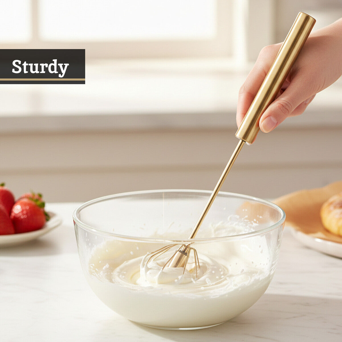 - Press and spin the whisk in light gold, 30 cm in length, for versatile daily tasks.